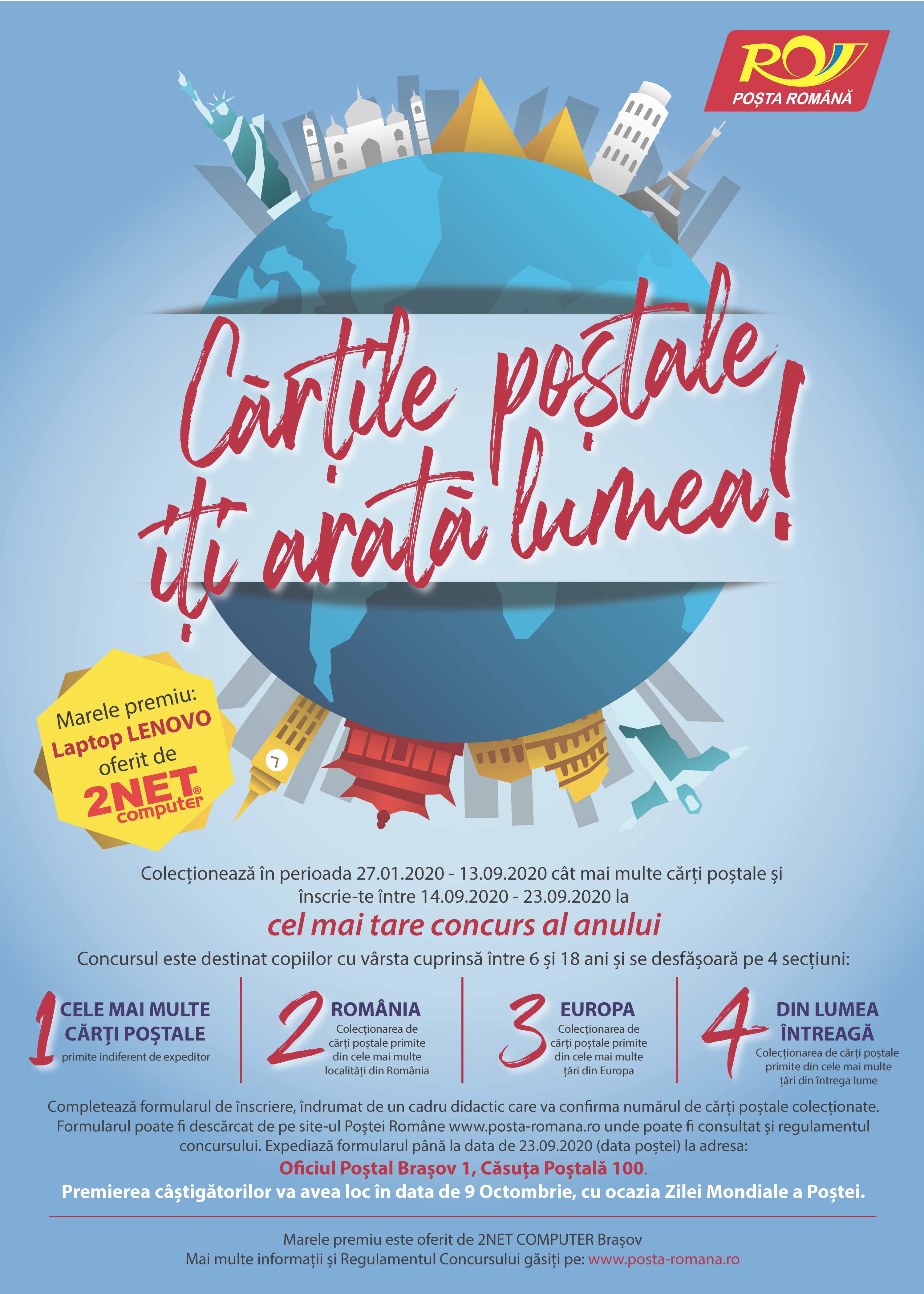 BUCUREŞTI, 27 ianuarie 2020 – Compania Naţională Poşta Română anunţă lansarea concursului “Cărţile poştale îţi arată lumea”. Evenimentul de lansare va avea loc astăzi, 27 ianuarie, ora 12:00, la sediul Oficiului Poştal Braşov 1 (str. Nicolae Iorga nr. 1, Braşov).