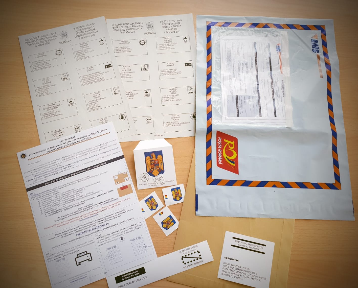 un autocolant cu adresa biroului electoral pentru votul prin corespondenţă;