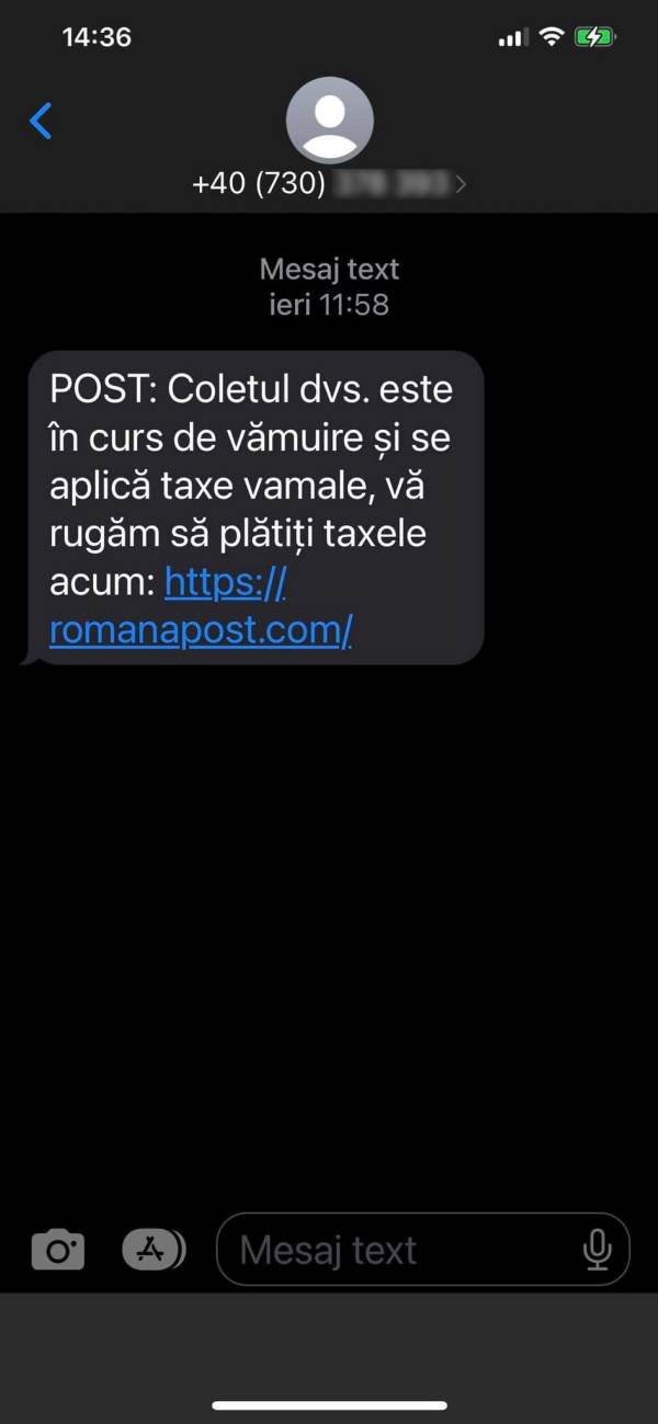 În ultimele zile mai mulți clienți au primit SMS-uri care îi îndeamnă să își scrie datele cardului bancar, cu scopul de a plăti taxe vamale pentru colete expediate. Pentru a fi cât mai credibil, SMS-ul mai oferă informații legate de numărul pachetului și de tipul de ambalaj.