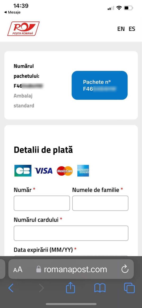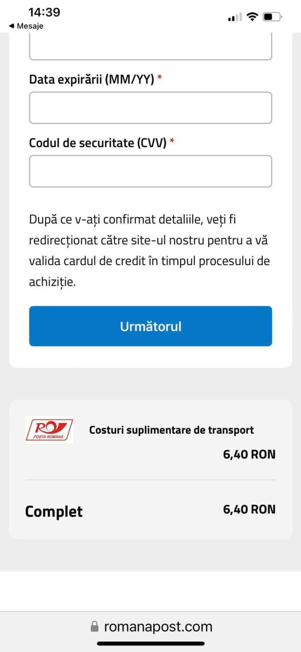 La sfârșit, clienții sunt îndrumați să își introducă datele cardului bancar pe pagina https://romanapost.com/