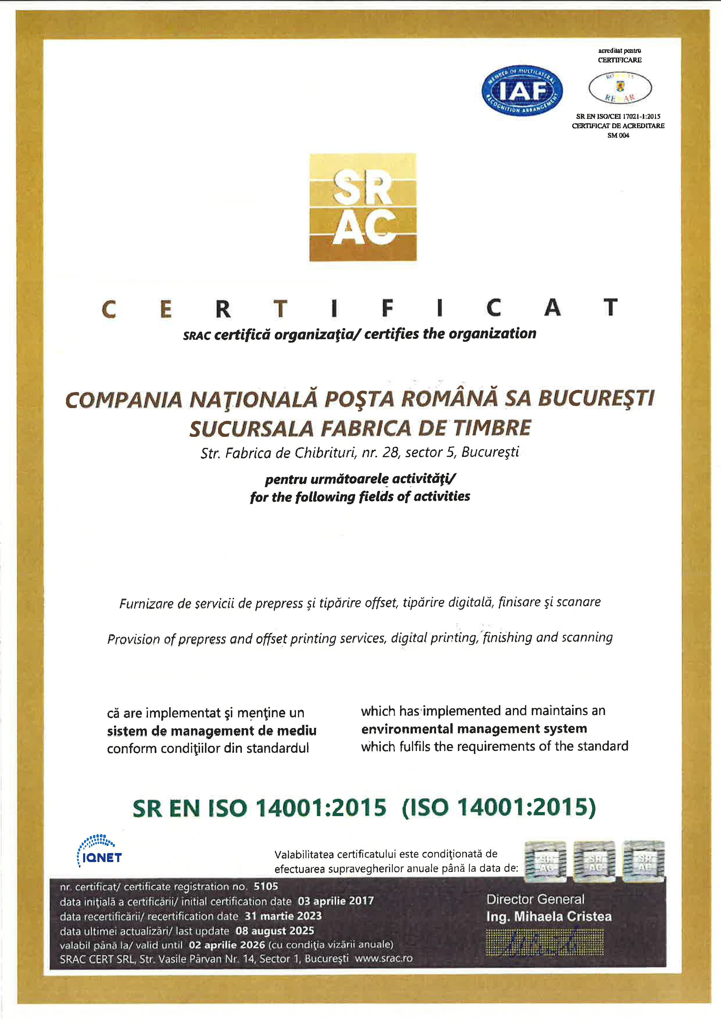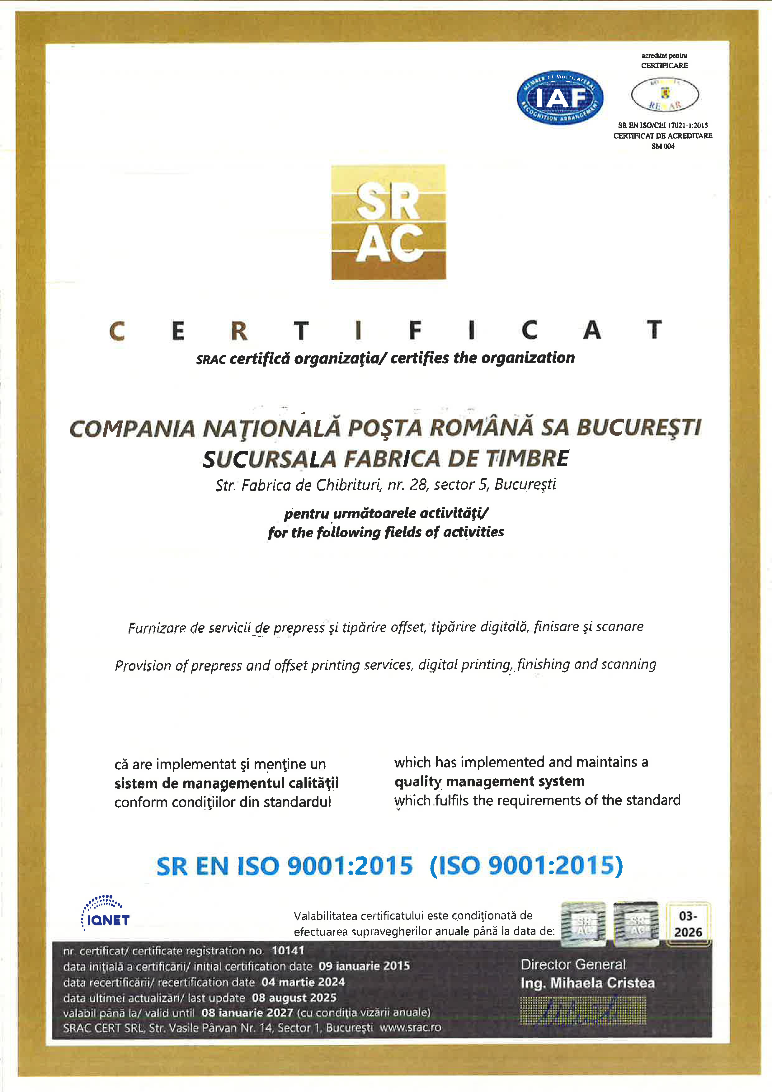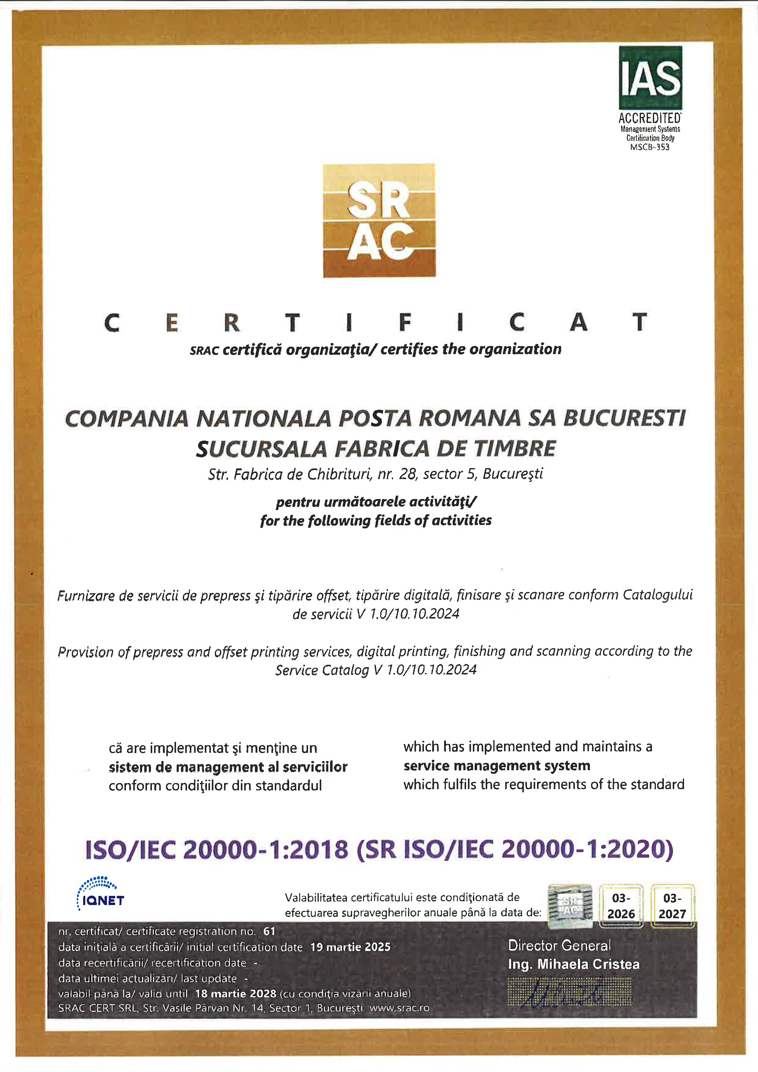 Certificări ISO Managementul Serviciilor Sucursala Fabrica de Timbre |