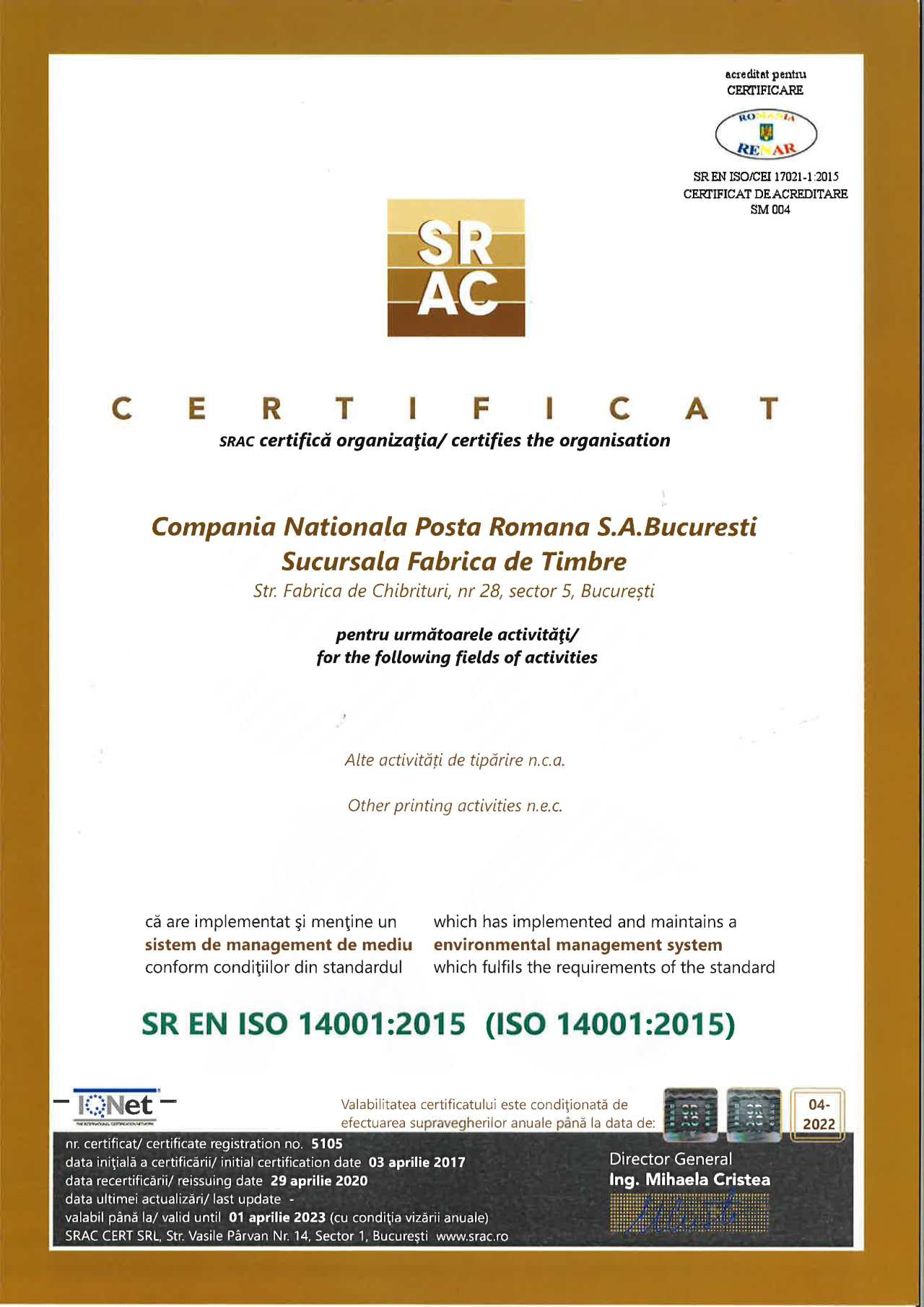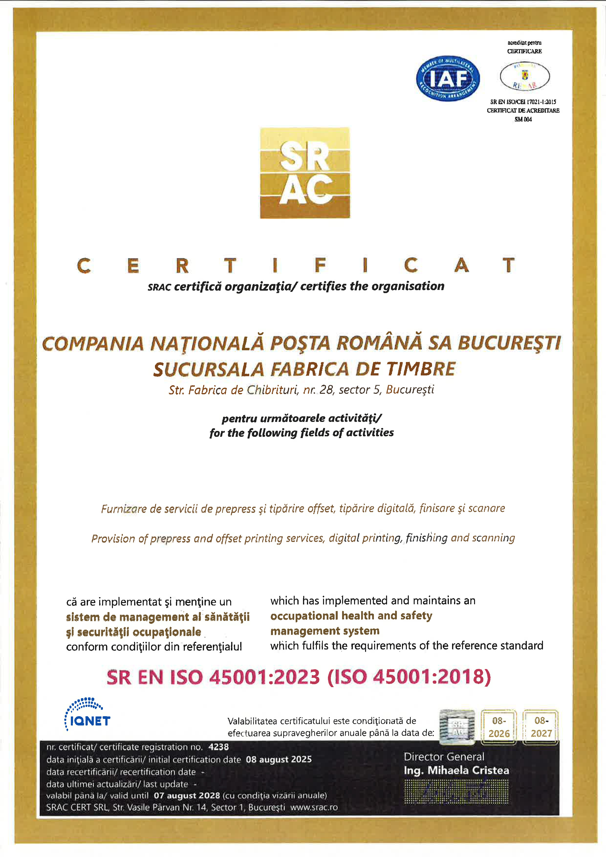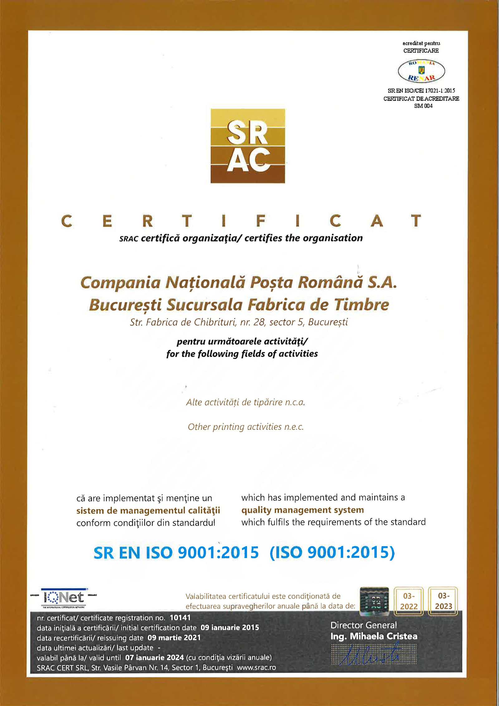 Certificări ISO Managementul Serviciilor Sucursala Fabrica de Timbre |