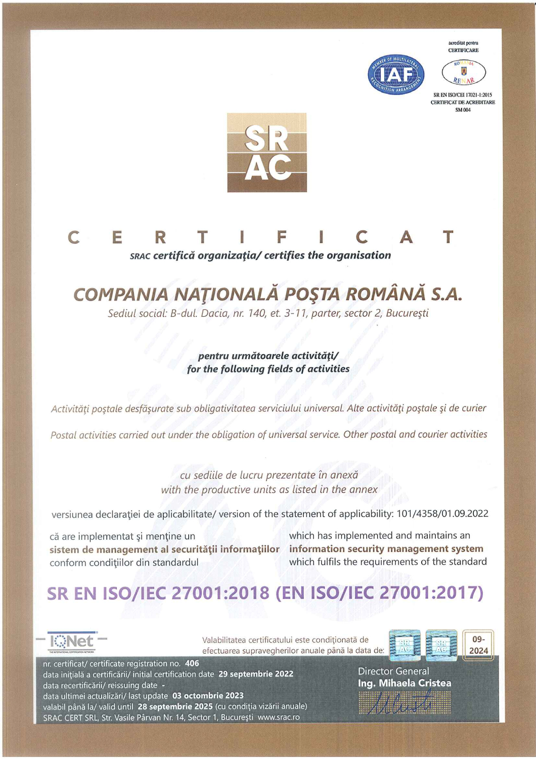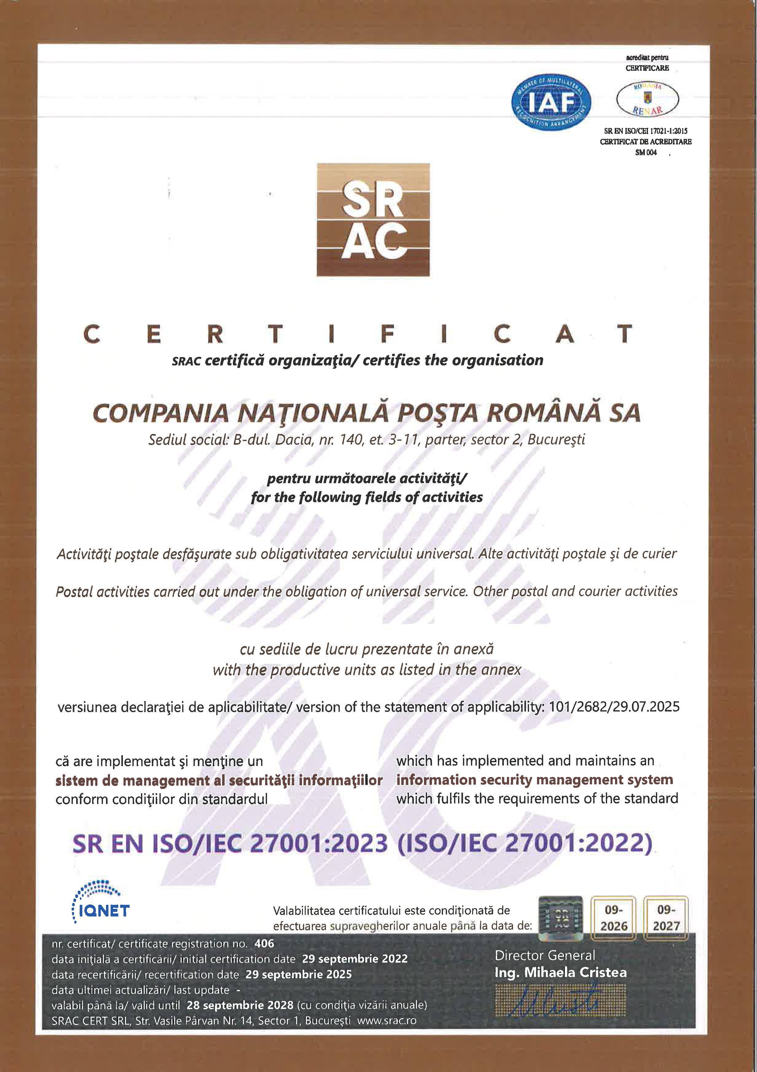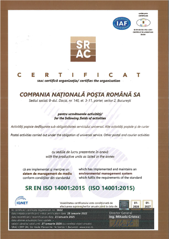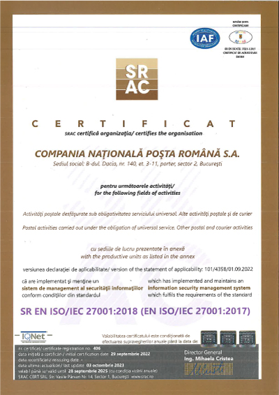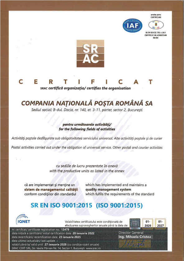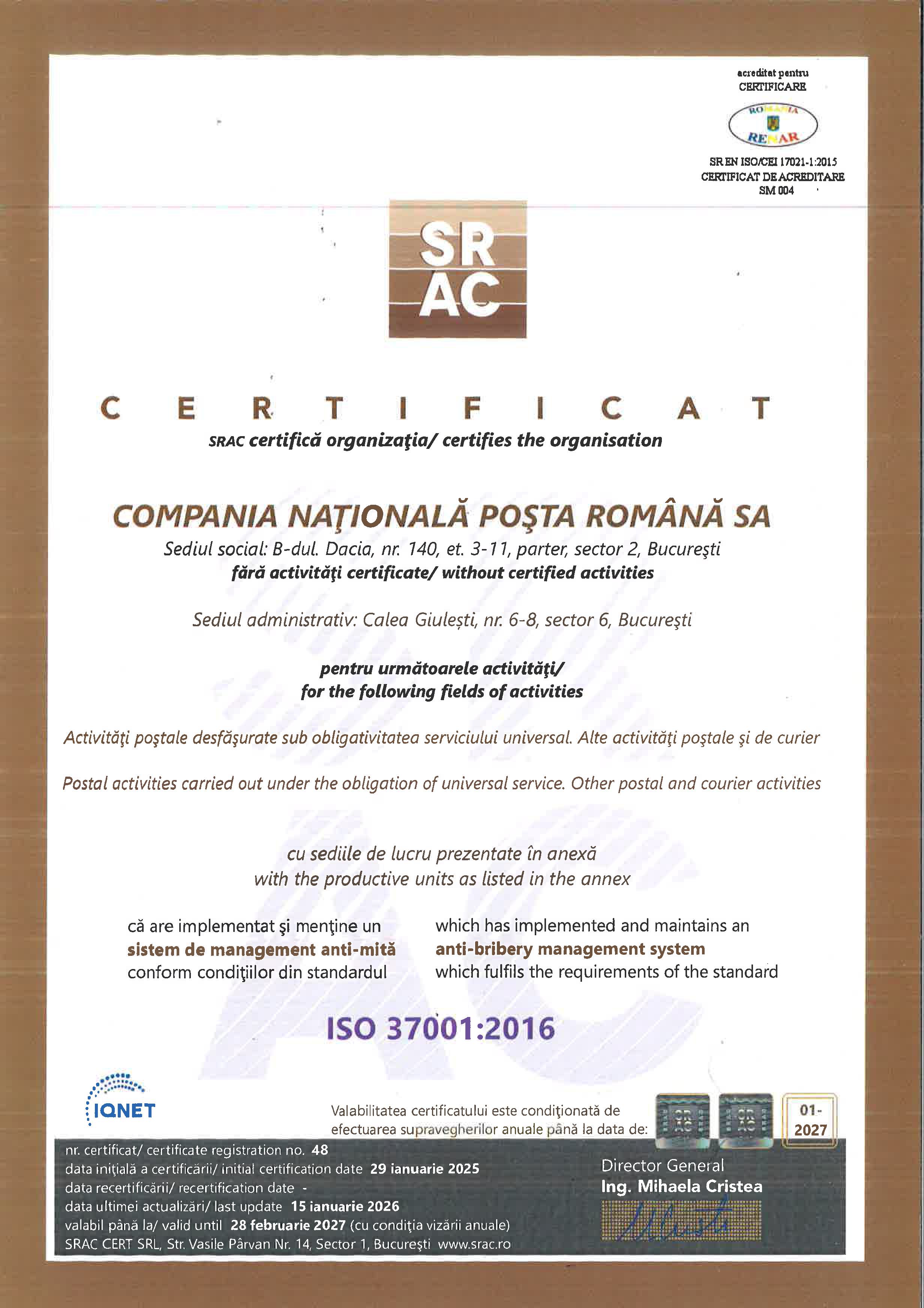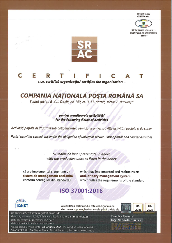 Certificat ISO Sistem de management anti-mită C.N. Poşta Română S.A |