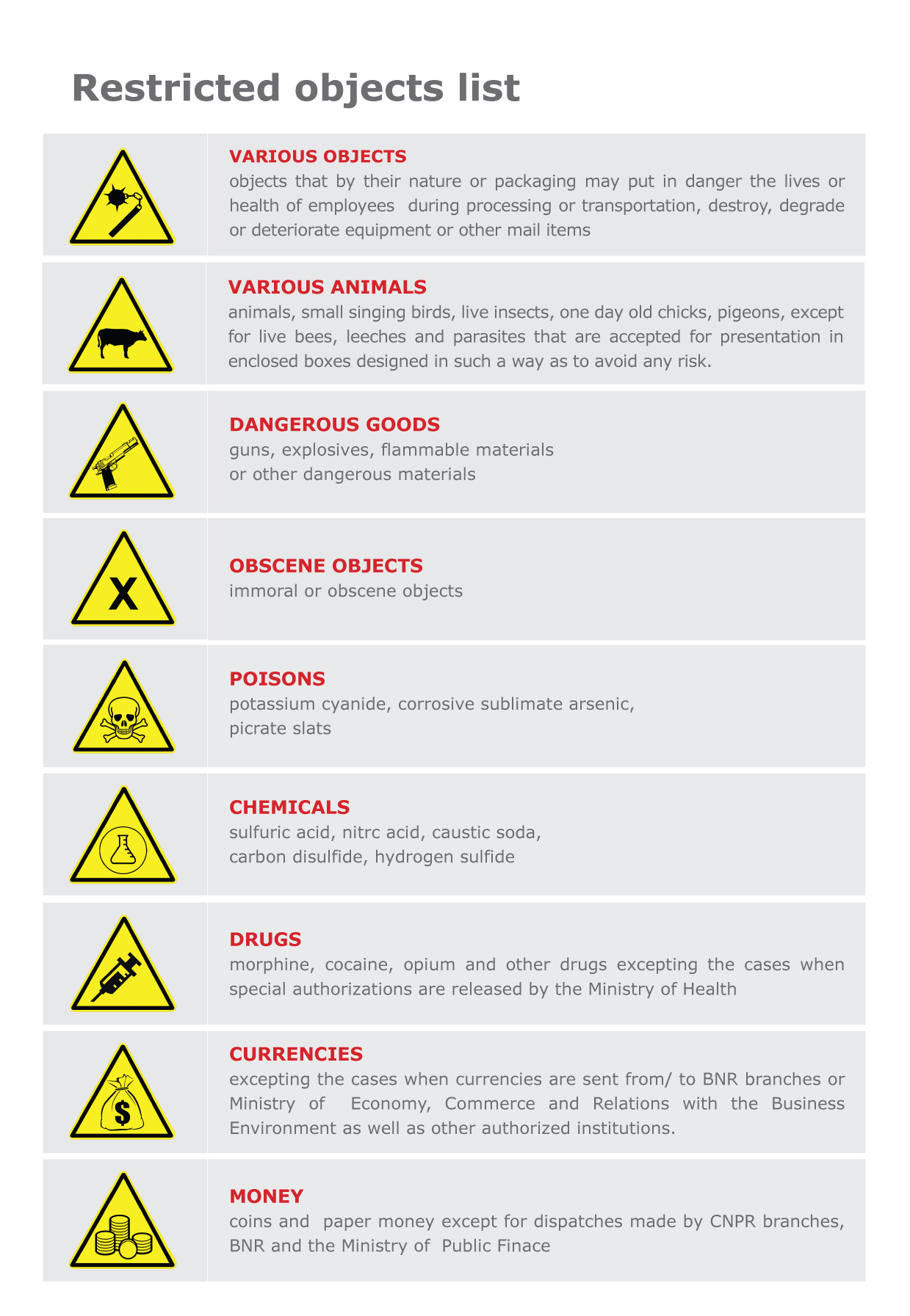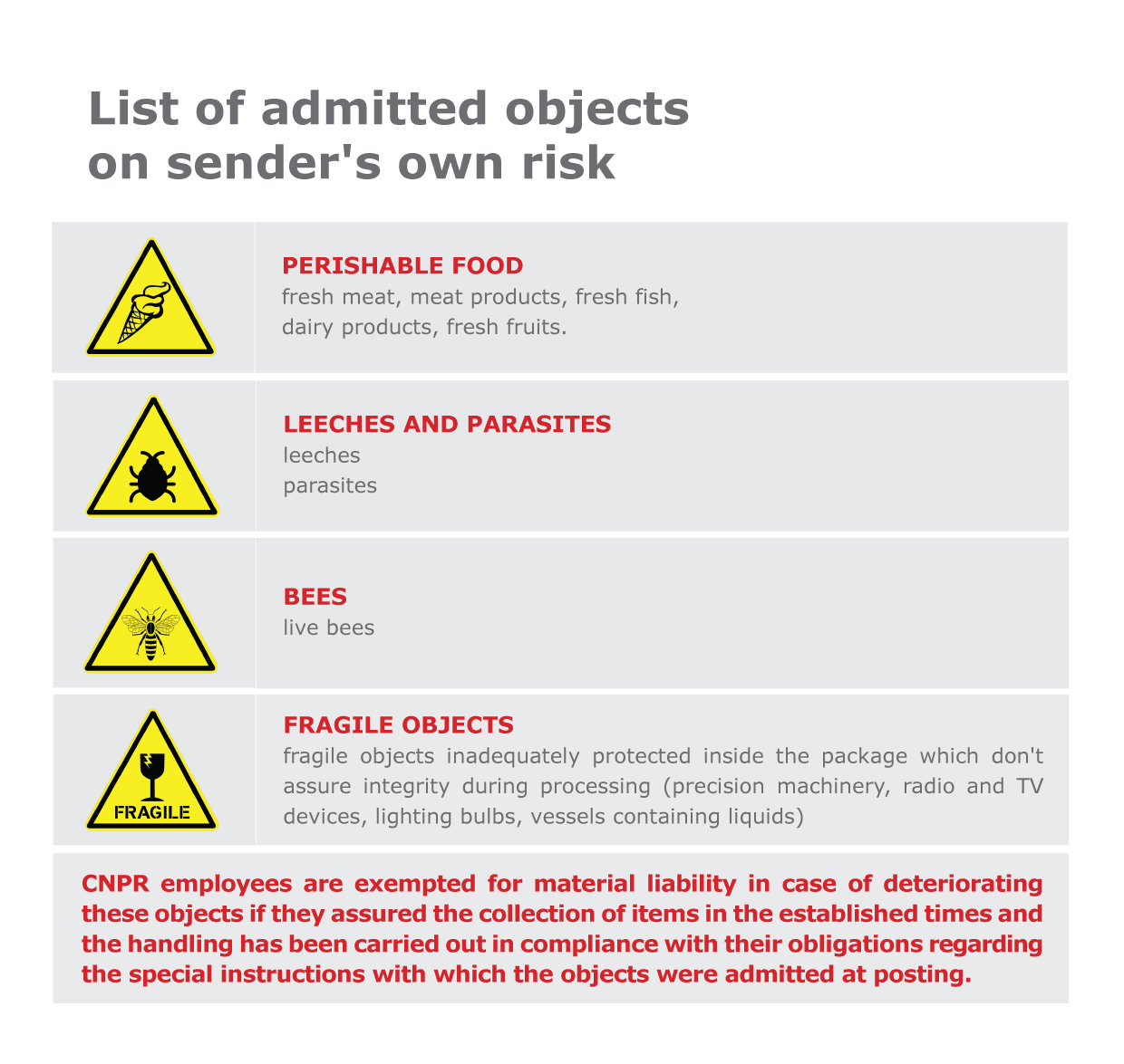 The particularity of this service consists in delivering to the sender the evidence regarding the delivery of the mail item, confirmed in writing by the recipient, proxy or mandated person. The acknowledgement of receipt form (A.R.) circulates attached to the mail item and is evidenced on the package of the mail item by writing the mention “A.R.”. It is non- priority service.